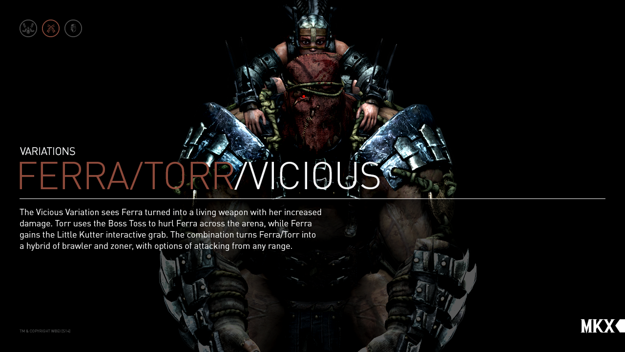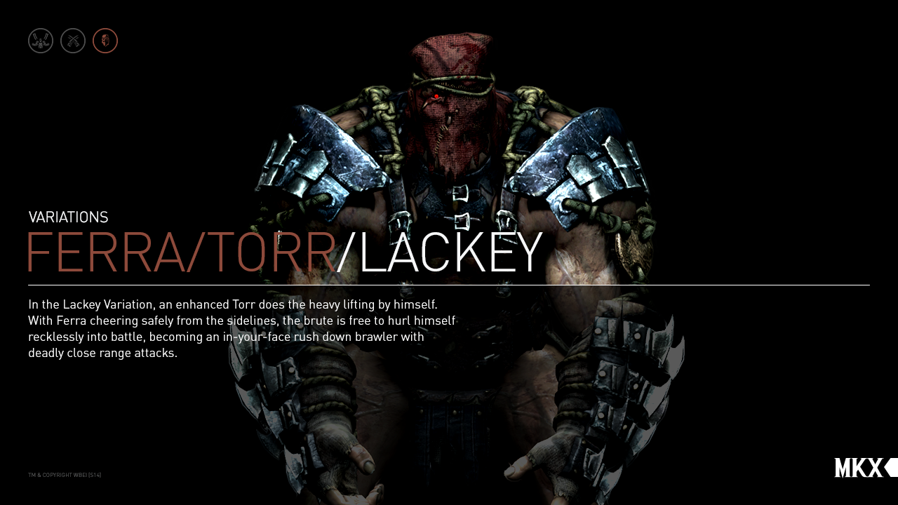 The dual being known as Ferra/Torr is mysterious even to their closest allies. It's rumored that Torr and Ferra were Outworld citizens, captured and permanently tethered to each other by the evil sorcerer Shang Tsung in the bowels of his Flesh Pits. They're more likely members of a forgotten symbiotic race, in which the "rider" bonds with a "mount." The rider, Ferra, serves as the de facto brains of the duo, while the hulking Torr is the muscle. It's possible they communicate with each other telepathically, or that Ferra can actually understand the booming grunts that are Torr's usual vocalizations. Found roaming the Tarkatan Wastes by Imperial troops, Ferra/Torr was trained/coerced into serving as Kotal Kahn's personal bodyguard.