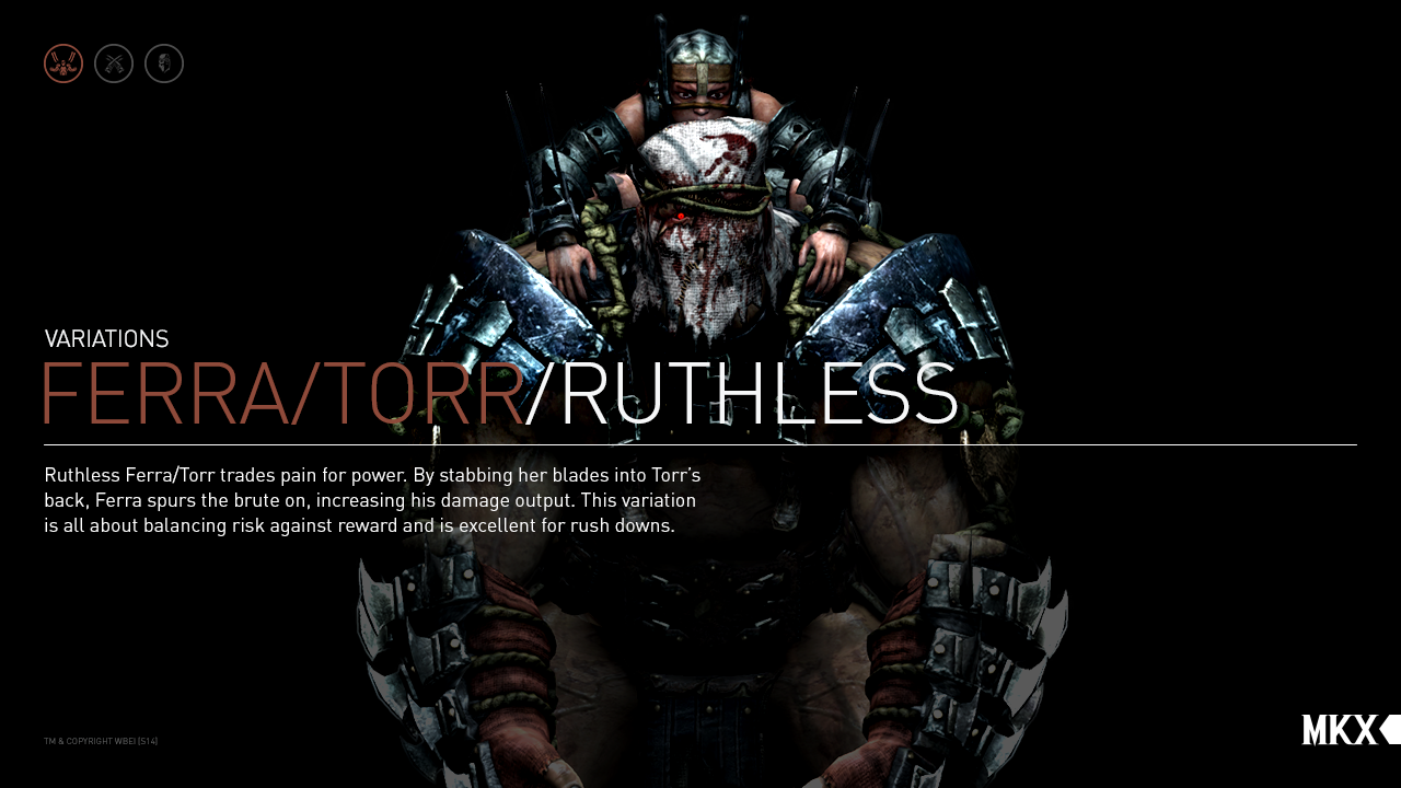 The dual being known as Ferra/Torr is mysterious even to their closest allies. It's rumored that Torr and Ferra were Outworld citizens, captured and permanently tethered to each other by the evil sorcerer Shang Tsung in the bowels of his Flesh Pits. They're more likely members of a forgotten symbiotic race, in which the "rider" bonds with a "mount." The rider, Ferra, serves as the de facto brains of the duo, while the hulking Torr is the muscle. It's possible they communicate with each other telepathically, or that Ferra can actually understand the booming grunts that are Torr's usual vocalizations. Found roaming the Tarkatan Wastes by Imperial troops, Ferra/Torr was trained/coerced into serving as Kotal Kahn's personal bodyguard.