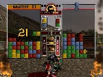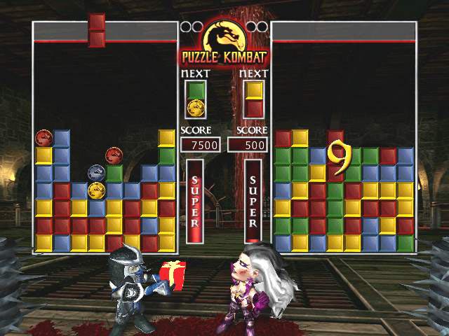 A mini-game introduced in Mortal Kombat: Deception. Puzzle Kombat is similar to Tetris, only with an MK twist. The characters fight against each other as colored blocks fall on their playing field. Players must link blocks of the same color together and use a Dragon Breaker to eliminate those blocks from the playing field. The first player to let their blocks reach the top, loses. The winning character will then perform a stage fatality on the loser. Every fighter also has a unique special attack that can be used when their super meter is filled completely.
